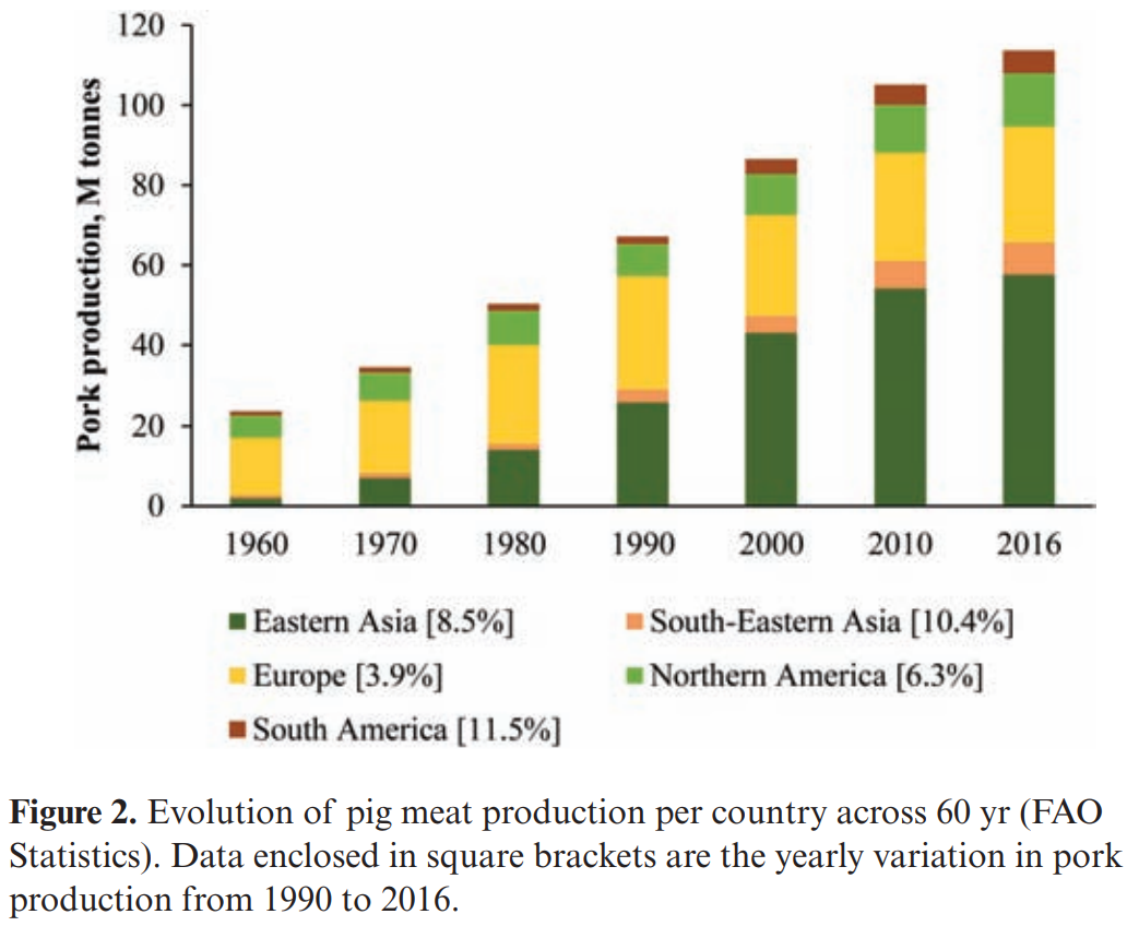 •1990년에서 2016년 사이의 양돈산업 성장을 보면, 상대적으로 유럽과 북미는 낮은 것과는 달리 신흥 국가 (예 : 남미 및 동남아시아)는 글로벌 돼지 고기 생산에 더 크게 기여하였다.