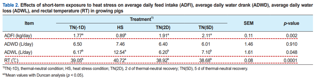 - 단기 HS에 노출된 돼지는 TN조건(-1D, 2D, 5D)에 비해 RT(p = 0.0001)가 상당히 증가했다.