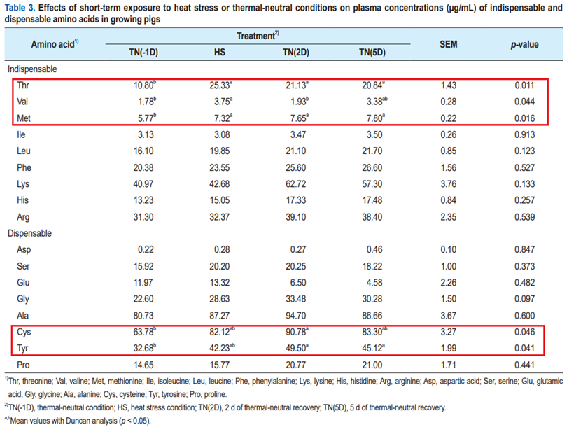 AA의 PC와 일부 대사 산물은 HS 조건 하의 돼지가 indispensable and dispensable AAs, 특히 Thr, Val, Met, Cys 및 Tyr에서 대사를 변경해야 함을 보여주었다.