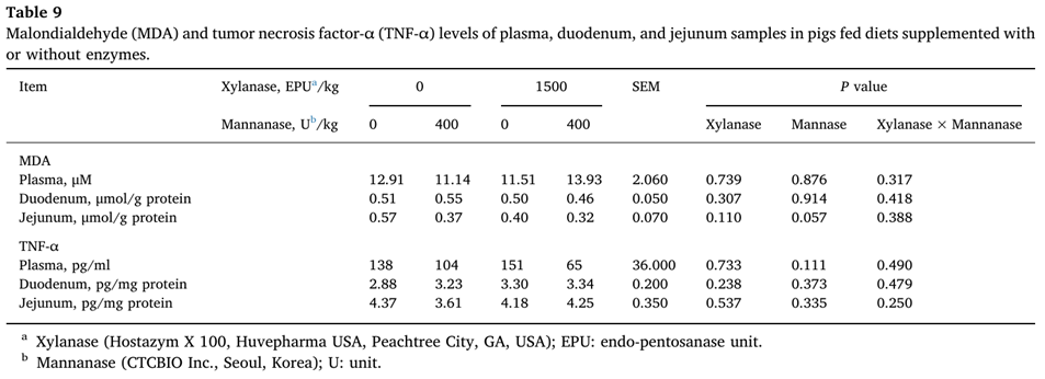 Mannanase 추가로 공장에서 MDA 농도(P=0.057)를 감소시키는 경향이 있었습니다(표 9).