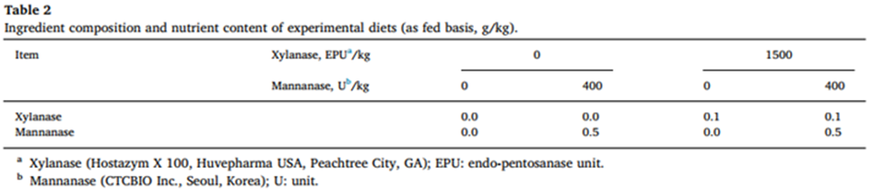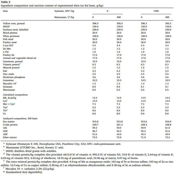 Xylanase는 0 또는 1500 endo-pentosanase unit(EPU)의 xylanase/(옥수수 DDGS kg)로 보충되었고, mannanase는 0 또는 400 unit의 mannanase/kg 옥수수 DDGS로 보충되었다.