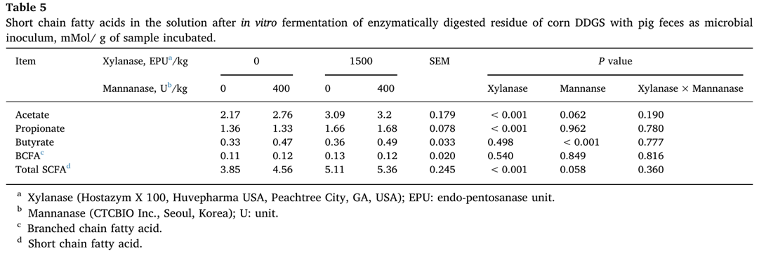 Xylanase의 추가로 SCFA, acetate, propionate의 농도와 총 NSP, arabinoxylan 및 GE의 AID 농도를 증가시켰다(P<0.05).