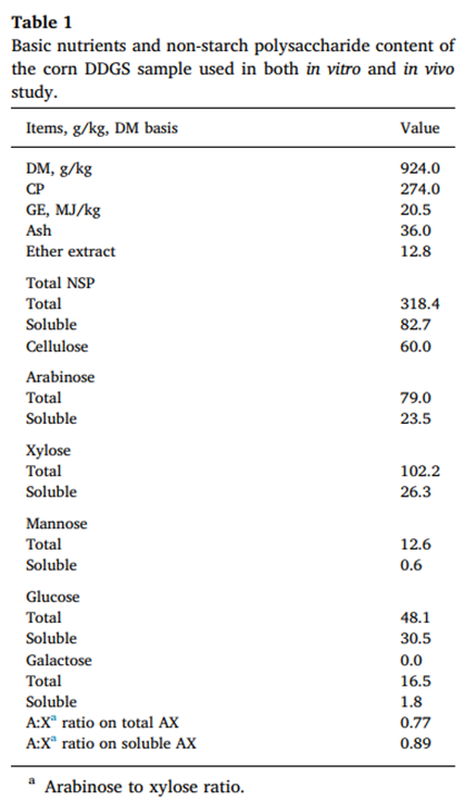 옥수수 DDGS 샘플을 분쇄하고, NSP(표1)를 포함한 영양 프로필에 대해 분석하고 2단계 시험관 내 소화(Boisen and Fernández, 1997)를 일부 수정(Jha et al., 2011)했다.