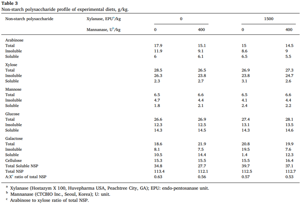 Xylanase and mannanase 추가사용은 표적 NSP의 소화율을 개선하고 장 건강을 개선할 수 있었다.