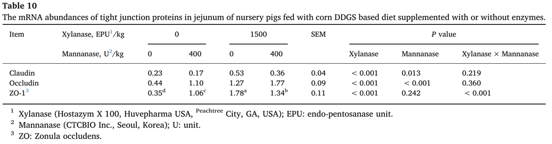 Arabinoxylan(AX) 과 ZO-1 농도의 소화율 계수(digestibility coefficient)에 대한 xylanase and mannanase 사이의 상호작용 효과(P<0.05)가 발견되었다.