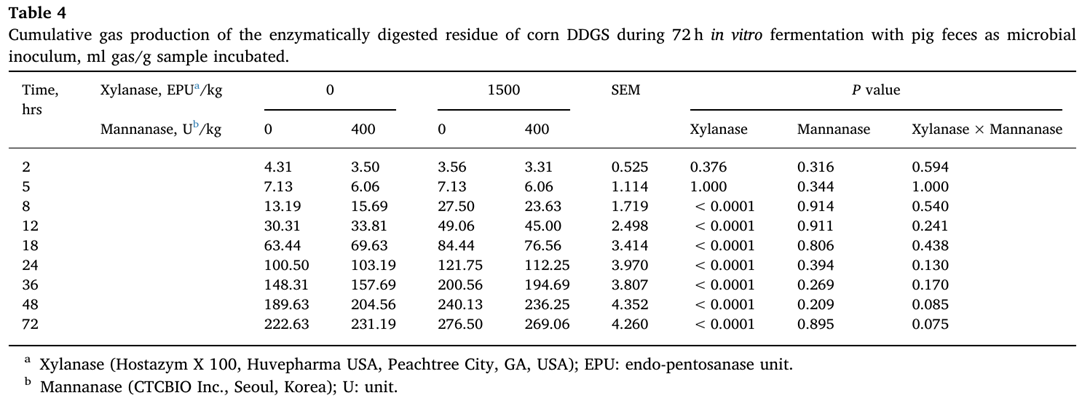 in vitro 실험은, xylanase(0 or 1500 endo-pentosanase unit of xylanase/kg of the diet)와 mannanase(0 or 400 unit of mannanase/kg of diet) 추가에 따라 효소적으로 분해된 잔류물을 2 × 2 factorial 배열 처리로 실험하였으며