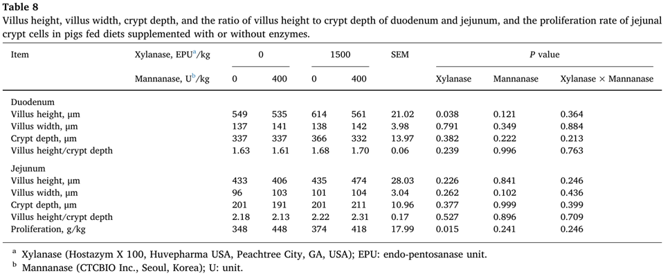 Xylanase 추가로 십이지장에서 융모 높이를 증가시켰고(P<0.05), 공장의 음와에서 증식 속도를 증가시켰다(표 8).