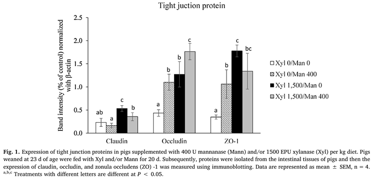 Mannanase 추가는 claudin과 occludin의 농도를 증가시켰습니다(P<0.05)(그림 1).