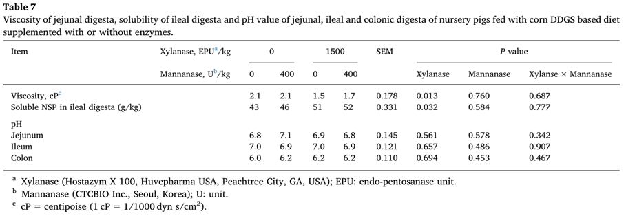 Xylanase 추가로 공장 소화의 점도를 낮추었으며(P < 0.05), 회장 소화에서 가용성 NSP의 양은 증가하였다(P<0.05).