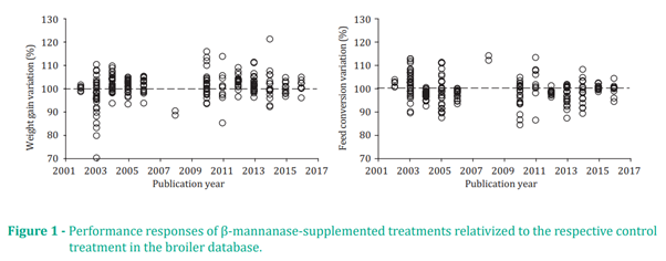 육계에서의 β-mannanase 첨가는 체중 증가에 영향을 미치지 않았지만 사료 전환율 feed conversion (-1%)이 향상되었습니다.