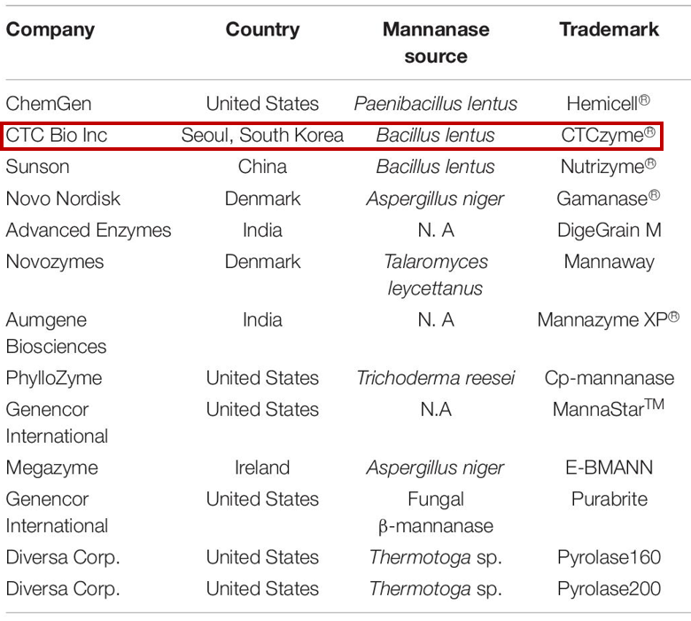 표 1. β-mannanases의 상업적 생산 정보