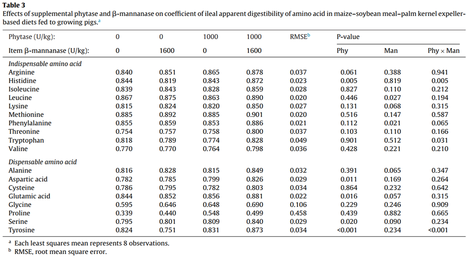 β-mannanase는 류신과 페닐알라닌의 CIAD를 각각 0.018과 0.019 증가시켰다(P<0.05).