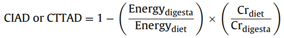 실험 식이에서 에너지에 대한 회장 겉보기 소화율(CIAD) 계수와 총관 겉보기 소화율(CTTAD) 계수는 Stein et al.(2007)에서 채택한 다음 방정식에 따라 계산되었습니다