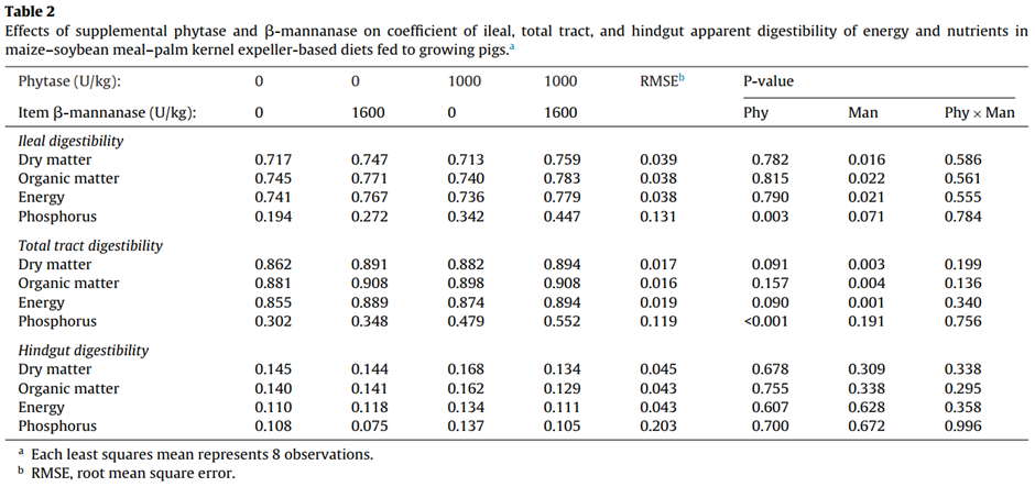 보충 β-mannanase는 건조 물질, 유기물 및 에너지의 CIAD를 0.035 ~ 0.038(P<0.05), 에너지의 CTTAD를 0.019(P<0.05) 증가시켰습니다.