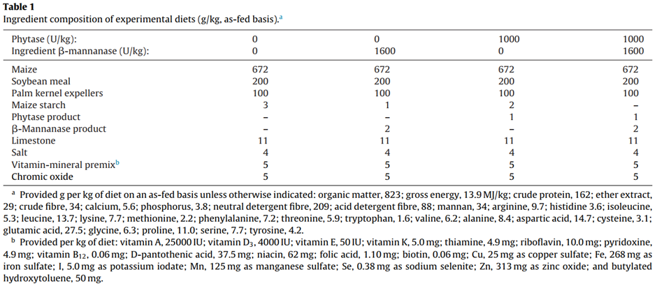 4가지 실험 식단은 0 또는 1000U/kg의 2가지 농도의 보충 phytase 0 또는 1600U/kg의 2가지 농도의 보충 β-mannanase를 사용하여 2 × 2 요인 처리 배열로 준비했습니다