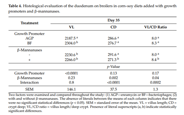 융모 길이 (VL)의 유의한 증가 (p<0.01)는 Barteriophages 첨가그룹에서 관찰되었습니다. 크립트 깊이 (CD)는 β-Mannanases 첨가그룹에서 감소되었습니다 (p<0.01). 그러나, VL/CD ratio는 β-Mannanases 첨가그룹에서 증가했습니다 (p<0.05) (Table 4).