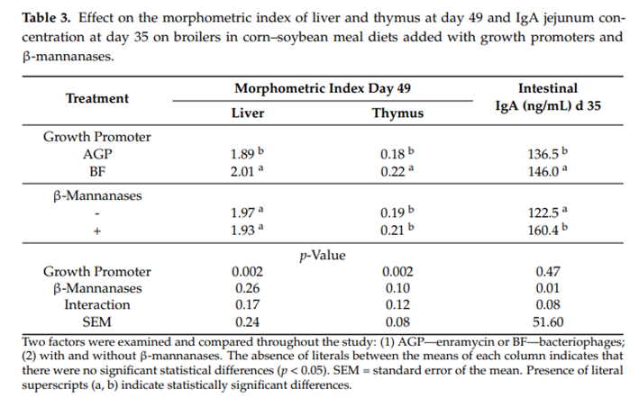엔라마이신, Bacteriophages, β-Mannanases가 첨가된 옥수수-대두박 사료를 급여한 Broiler 육계에서 형태계량학적 지수 (49일차, IM) 및 공장내 IgA 농도 (35일차)에 대한 효과는 Table 3에 결과가 요약되어 있다. β-Mannanases 첨가그룹에서 공장내 IgA의 증가 (p<0.01) 되었다. 또한 Bacteriophages 첨가그룹에서 간과 흉선 크기 (IM)의 증가 (p<0.01)를 보였다 (Table 3).