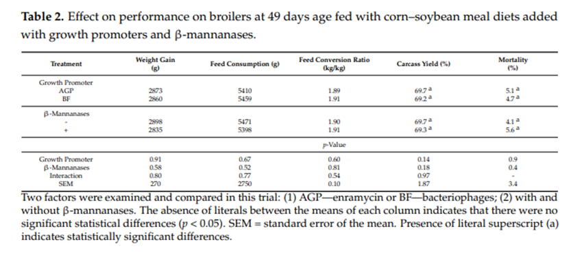 Table 2는 엔라마이신, Bacteriophages, β-Mannanases가 첨가된 옥수수-대두박 사료를 급여했을 때 49일령 Broiler 육계의 성장능력에 미치는 영향의 결과를 보여줍니다. 대조군과 실험군 사이에 증체량, 사료섭취량, 사료효율, 도계량 또는 폐사율 측면에서 유의한 차이가 관찰되지 않았습니다 (p > 0.05) (Table 2).