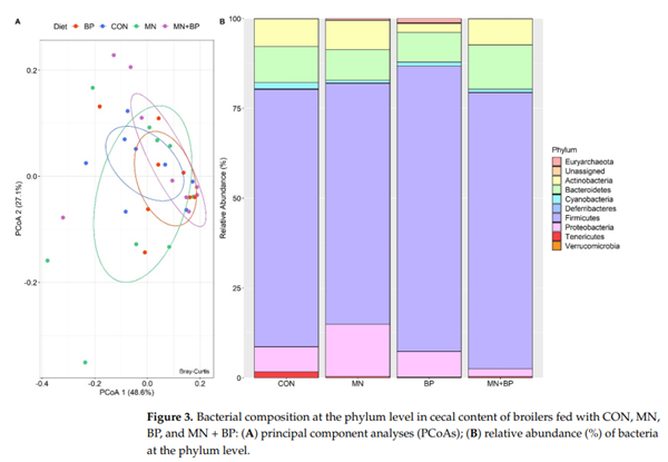 MN + BP 혼합첨가그룹에서는 Proteobacteria의 양적 성장을 감소시키고 Bacteroidetes의 양적 성장을 증가시키는 경향을 보여서, 유익미생물 균총이 우점됨을 알 수 있었습니다. 결론적으로, 본 시험결과는 β-Mannanases와 Bacteriophages (MN + BP)의 혼합 적용이 Poultry Nutrition에 잠재력이 크다는 것을 보여줍니다. 향후 MN + BP 조합의 작용 기전을 자세히 확인하는 추가 시험을 기대하고 있습니다.