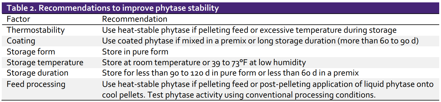 열 안정성, 코팅, 저장 형태, 저장 온도, 저장 기간 및 사료 가공을 포함하여 phytase 안정성에 영향을 미치는 많은 요인이 있습니다(Table 2).