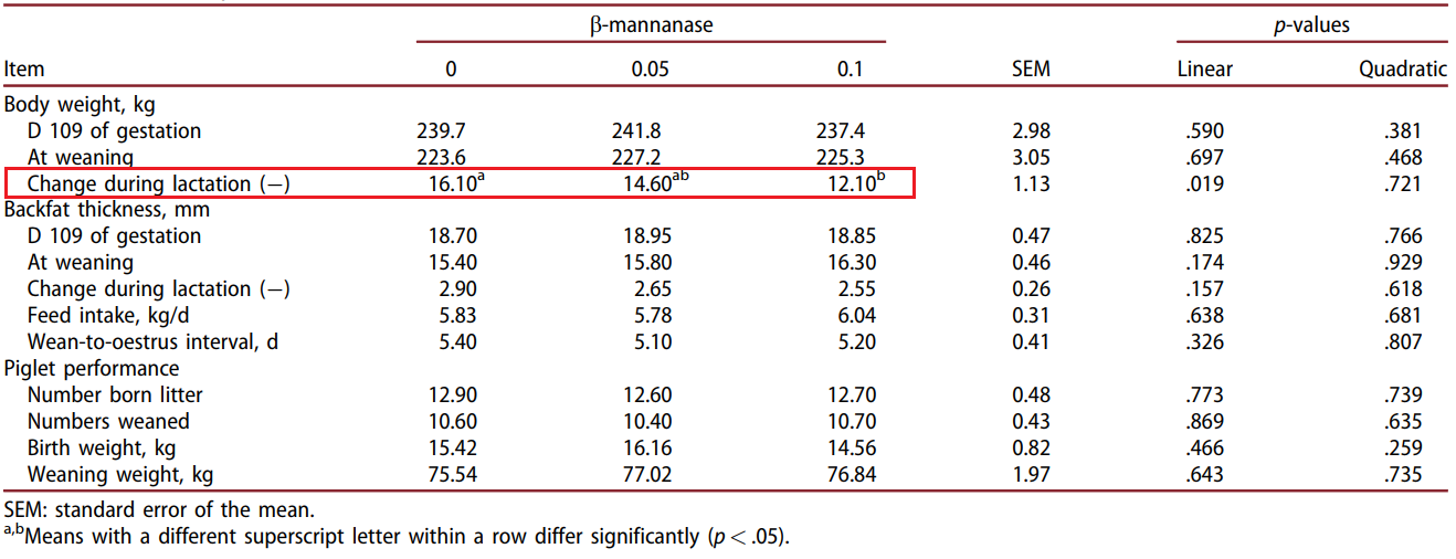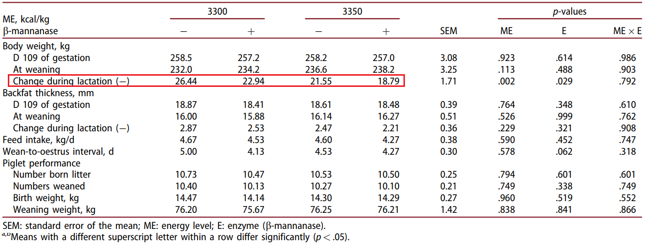 그러나 식이 에너지 증가와 β-mannanase 보충은 수유 중 모돈의 체중 손실을 유의하게 감소시켰습니다(p < 0.05).