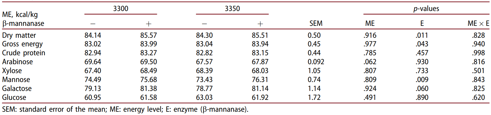 또한, 식이 β-mannanase는 갈락토스의 소화율을 향상시키는 경향이 있었습니다(p=0.06).