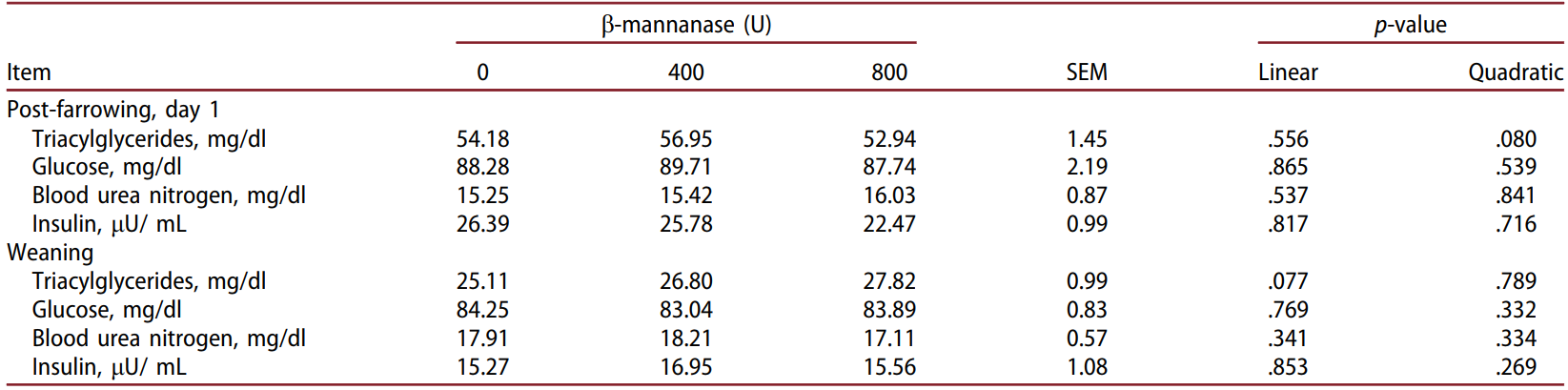 β-mannanase의 식이 수준을 높이는 것은 모돈에 있어서 분만 후 및 이유 시 혈액 대사 산물(트리아실글리세리드, 포도당, BUN 및 인슐린)에 영향을 미치지 않았습니다(p > .05) (Table 4).