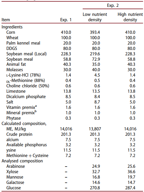 Exp.2에서 DM, GE, CP, xylose, mannose, galactose 및 glucose의 ATTD는 식이 에너지 수준의 영향을 받지 않았습니다. 그러나 아라비노스 소화율은 고열량 식단에서 더 큰 경향이 있었습니다(p=0.06).