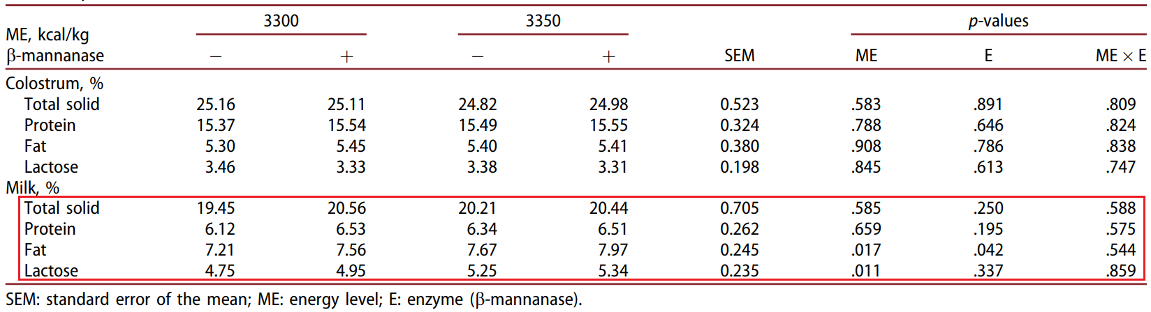 또한, β-mannanase 보충은 우유의 유당을 유의하게 증가시켰습니다(p < .05).