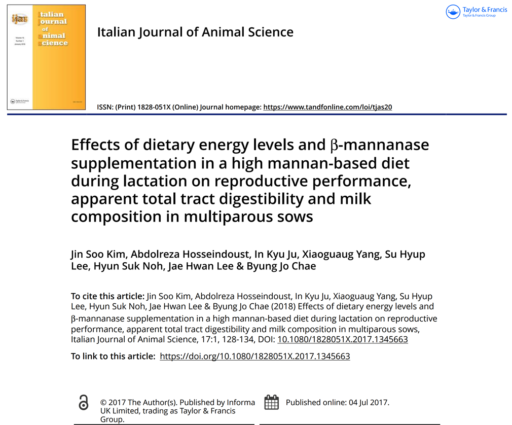 따라서 돼지 사료에서 NSP의 유형과 함량에 따라 외인성 효소를 보충하는 것이 잠재적인 이점을 얻는 데 필수적입니다. 따라서, 본 실험의 목적은 수유기 동안 β-mannanase의 식이 보충이 다산모돈의 번식 능력과 초유 및 우유 조성에 미치는 영향을 조사하는 것을 목적으로 합니다.
