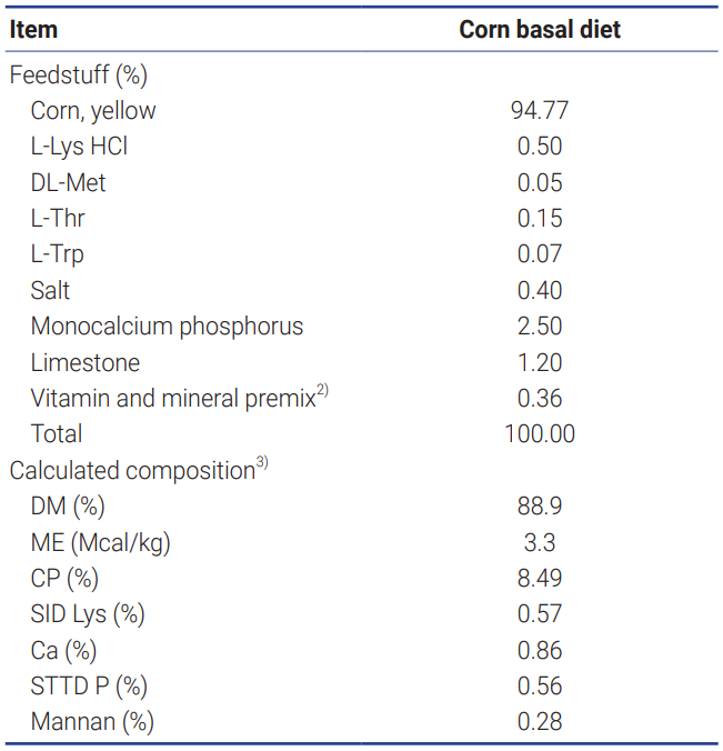 기본 식단은 옥수수(94.8%)와 에너지 및 필수 아미노산 공급을 위한 보충 아미노산으로 구성되었습니다( Table 1.).