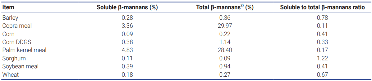 Table 6. Compositions of soluble and total β-mannans in feedstuffs (as-is basis)1)