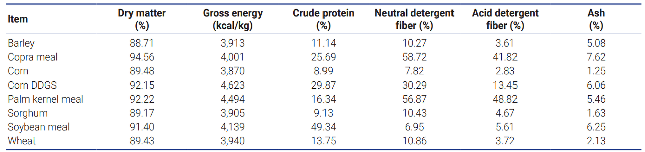 본 연구에서 분석된 사료원료의 GE와 CP의 조성은 코프라박과 팜커널박을 제외하고는 NRC에 기술된 값과 유사하게 나타났습니다.