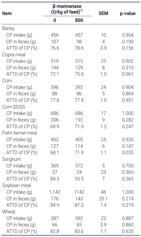 β-mannanase 보충은 보리, 코프라박, 옥수수, 옥수수 DDGS, 팜커널박, 수수, 대두박 또는 밀이 함유된 사료를 먹인 돼지의 CP 섭취량과 분변 배설량에 영향을 미치지 않았습니다(Table 4 ).