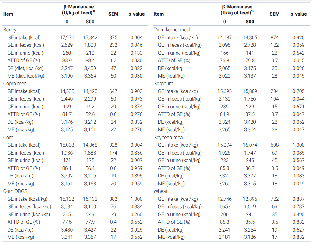 β-mannanase 보충은 보리, 야자박, 수수, 대두박의 ME를 개선시켰고, 육성돈에서 copra meal과 palm kernel meal의 ATTD of CP 를 개선시켰습니다.