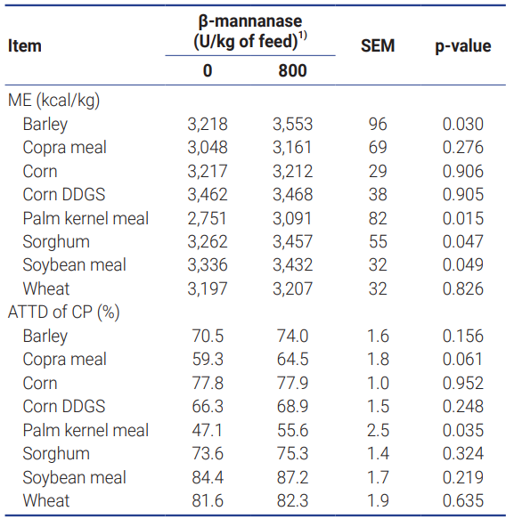 또한, 본 연구에서는 β-mannanase 보충에 따른 ATTD of CP 변화는 사료원료 중 가장 낮은 단백질 소화율을 보이는 copra meal과 palm kernel에서 검출되었습니다.