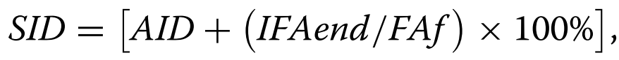 우리의 이전 연구에서는 지방 무첨가 사료 방법으로 얻은 지방(ELF)과 지방산(ELFA)의 기저 내생적 손실을 기준으로 겉보기 회장 소화율(AID)을 보정하면 SID 값을 정확히 추정할 수 있음을 보여주었습니다 [11].