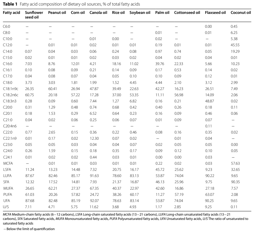 앞서 설명했듯이, 더 짧은 사슬 길이와 (또는) 더 높은 불포화도를 가진 지방산은 더 빠르고 완전하게 소화 및 흡수되며 [39, 40], 이는 더 높은 소화 계수를 초래합니다.