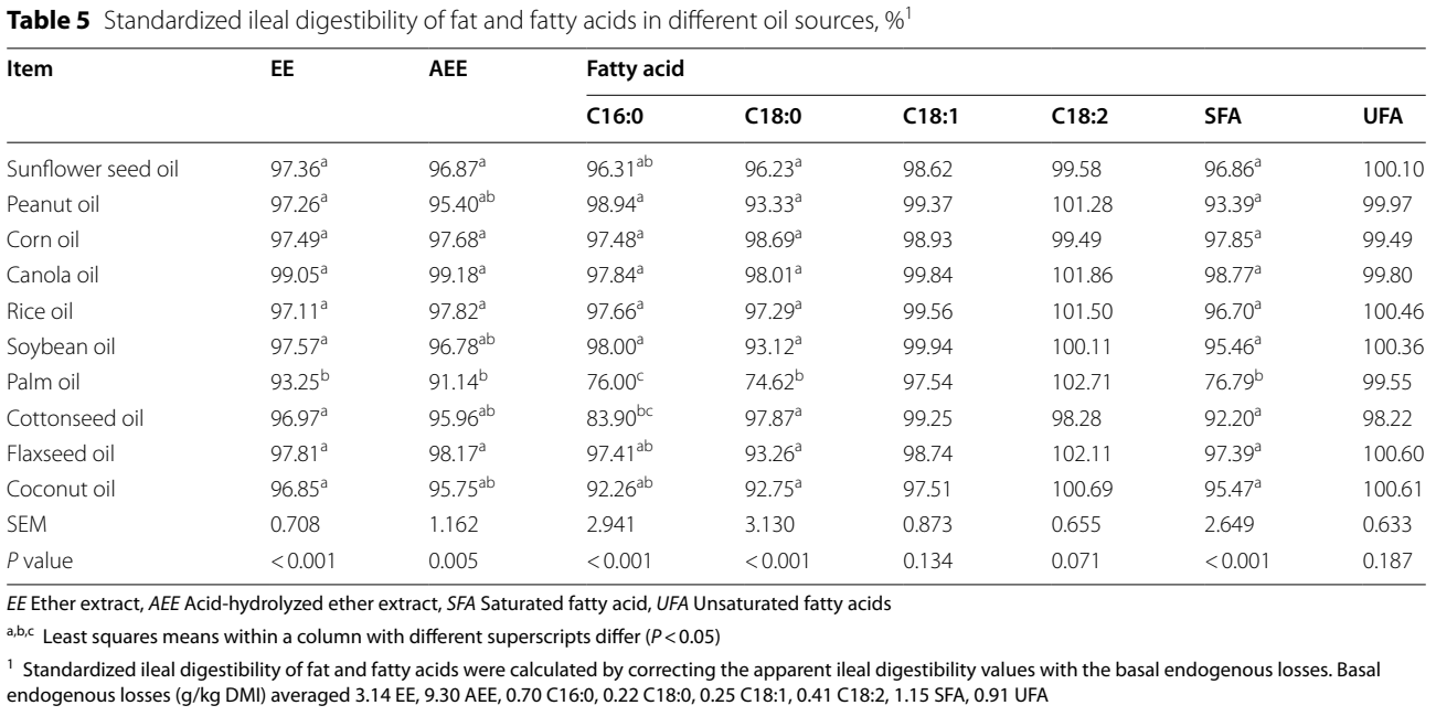 식이유지 공급원에 따라 지방, C16:0, C18:0 및 SFA의 SID(표준화된 소화율)에 유의한 차이가 있었습니다(표 5; P < 0.01).