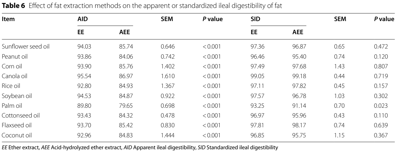 AEE의 AID는 EE(에테르 추출물)보다 높았지만(P < 0.01), 팜유를 제외하면 EE와 AEE의 SID에는 유의한 차이가 없었습니다(표 6).
