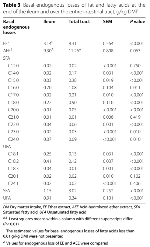 다양한 지방 원료에 대한 지방 및 지방산의 SID에 관한 보고는 기초 내인성 손실 지방(ELF) 및 내인성 손실 지방산(ELFA) 측정의 제한으로 인해 적었습니다.