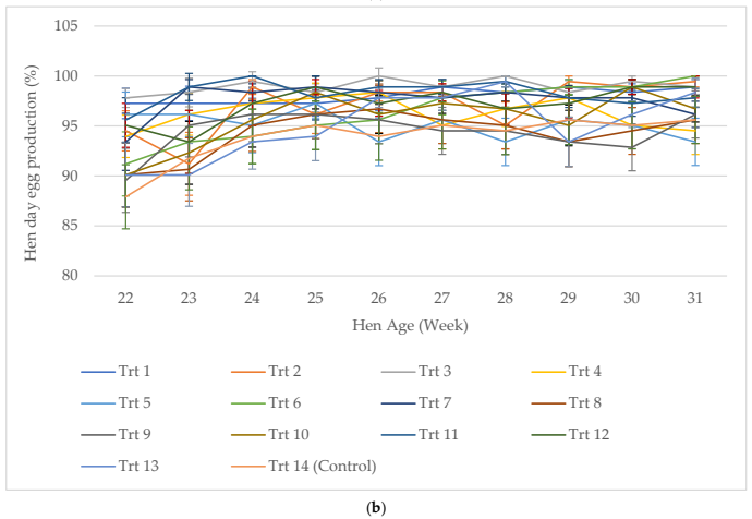 - 시험 처리군 간 산란율, 산란계수(hen-day production), 산란량 등은 유의한 차이가 없었으나, 시험군은 Hy-Line Brown 품종의 기준 성적(95~99%)과 유사한 수준을 유지함.
