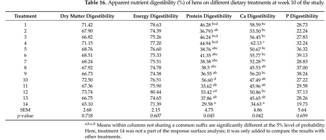 반면에, 단백질(CP)과 칼슘(Ca)의 소화율에서는 일부 처리구 간 통계적으로 유의한 차이가 확인되었습니다 (p < 0.05).