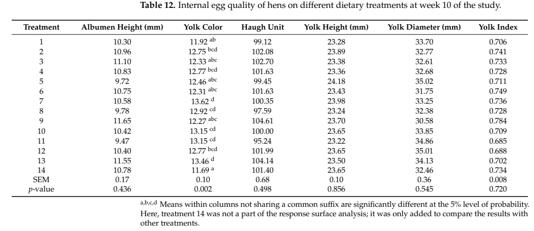처리에 따른 체중, 혈청 칼슘, 계란 전반적 품질에는 유의한 차이가 없었으나, 노른자 색상은 대조구에서 유의하게 낮은 점수(p = 0.002)를 나타냈습니다.