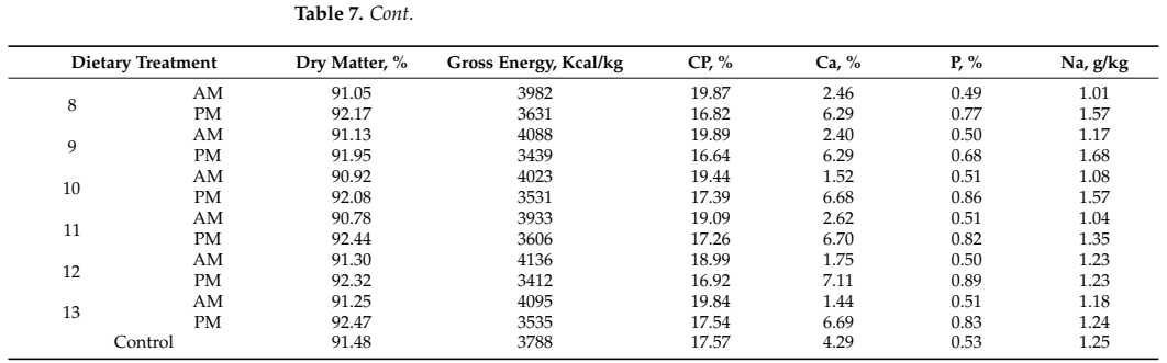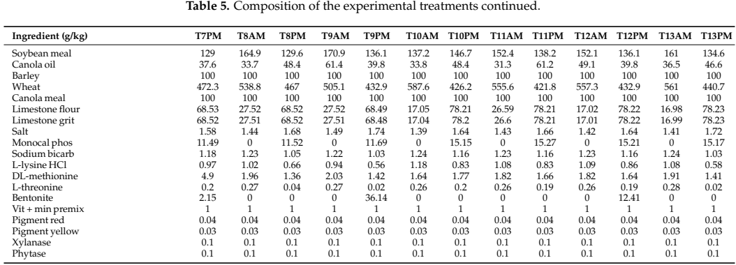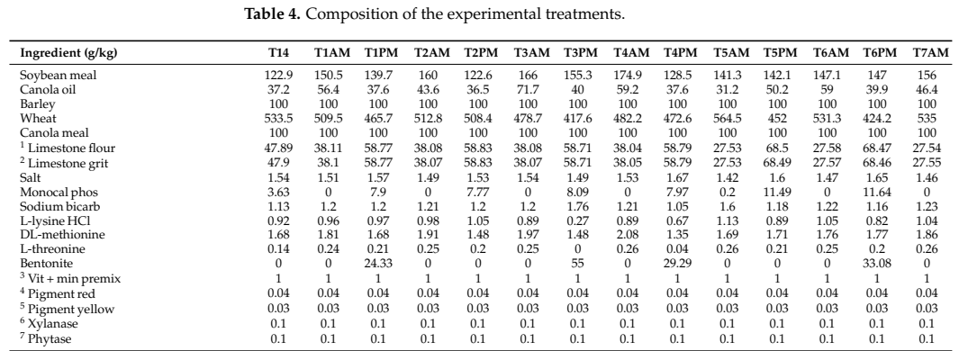 본 실험은 총 13개의 시험구와 1개의 대조구(CP 19%, Ca 4.1%, AME 11.6 MJ/kg)를 대상으로 10주간 실시되었으며, 각 시험구는 AM/PM 식이로 설계되어 다음과 같은 3단계 수준을 포함합니다: