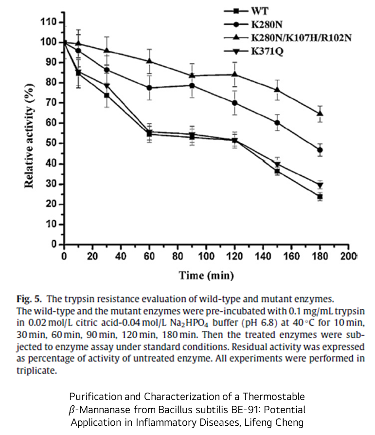 - 단백질 분해 저항능력 확보를 통해 소화 중 전반적으로 효과 미칠 수 있음