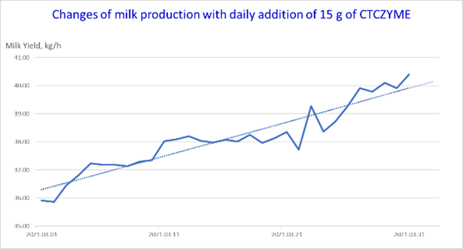 ▶ 착유우 두당 15g의 CTCZYME® 첨가로 산유량 4.5 kg 증가두당 15g의 CTCZYME® 첨가로 산유량 4.5 kg 증가