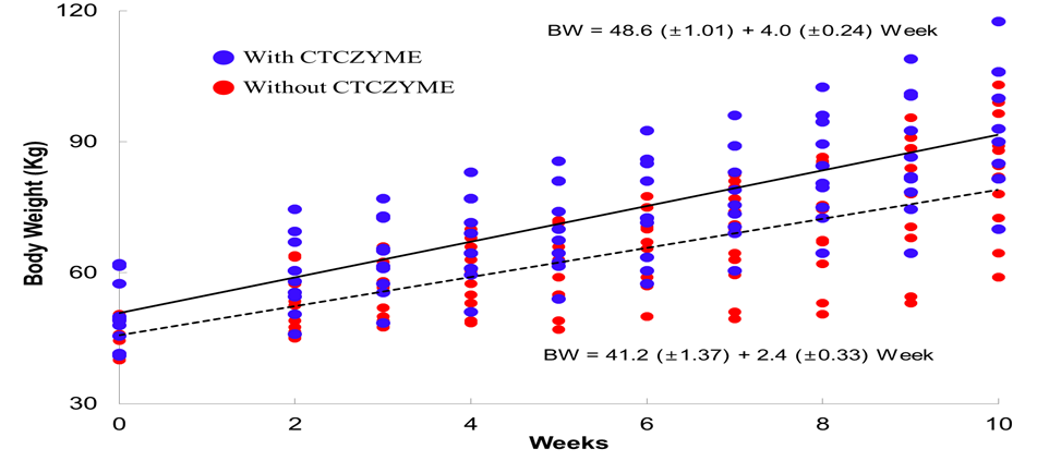 | CTCZYME 무첨가 | 2.43 kg | 1.56kg/주 추가 증체 |