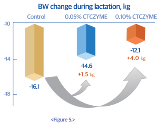 (5) 옥수수-대두박 위주의 경산돈 사료를 팜박과 옥수수주정박으로 대체한 사료에 CTCZYME을 0, 0.05 및 0.1% 첨가할 경우, 효소첨가량이 증가할수록 포유기간중 체중손실량이 감소를 보였고, 에너지 및 mannose의 외관상 전장 소화율이