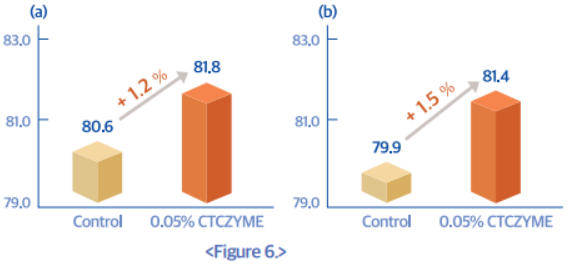 (1) 옥수수-대두박 위주의 기초사료내 옥수수주정박을 20% 대체한 실험사료에 CTCZYME 0.05% 첨가된 사료를 육성돈에 42일간 급이한 결과 영양소 소화율및 사양성적이 향상됨 (Kim et al., 2013).